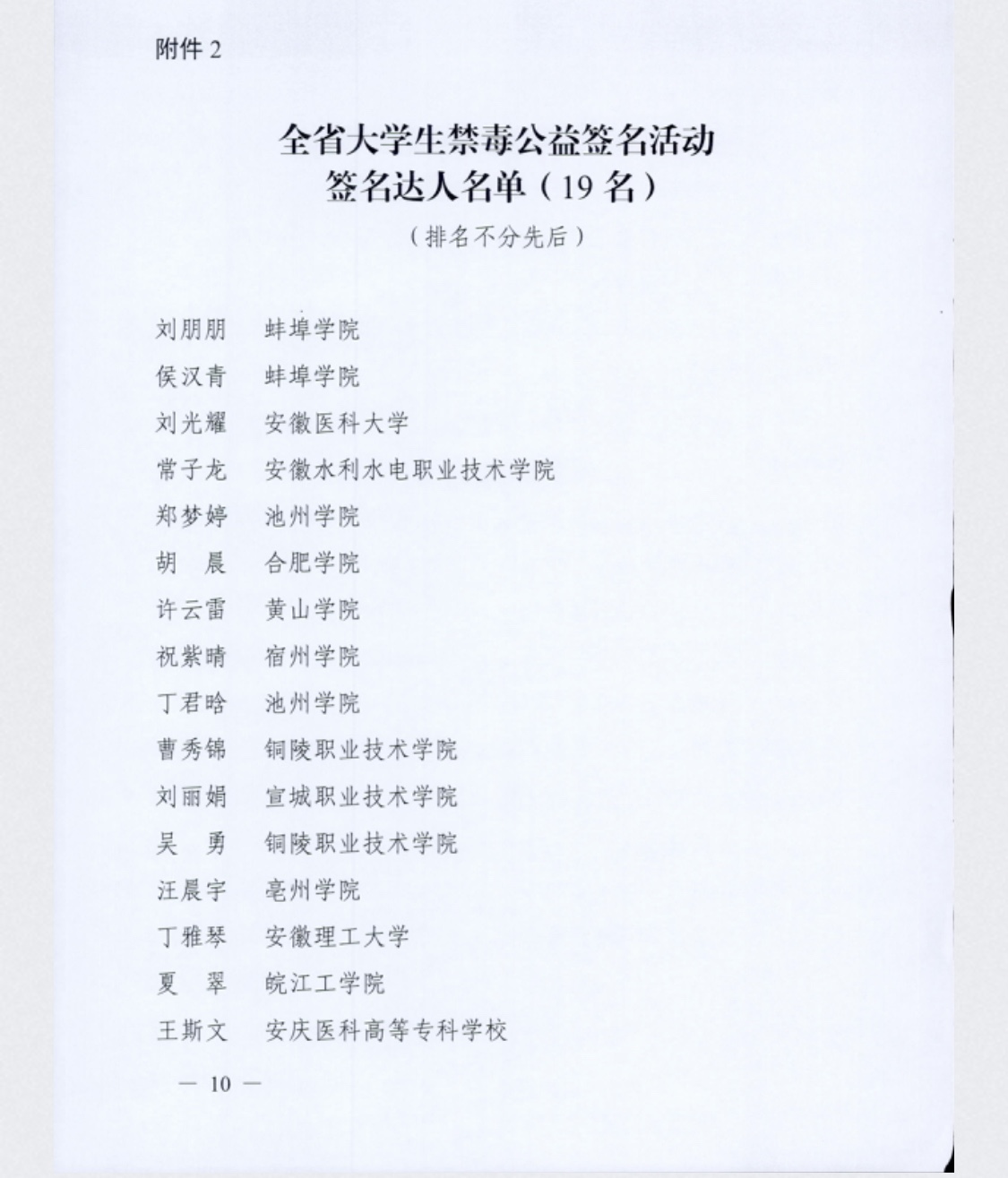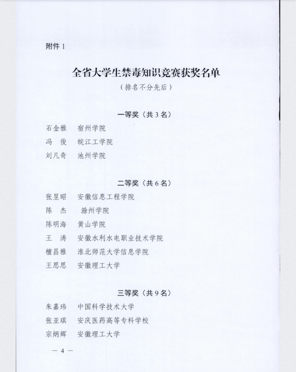 本次全省大学生禁毒知识竞赛设一等奖3名、二等奖6名、三等奖9名,优秀奖100名,全省禁毒公益签名活动签名达人19名。