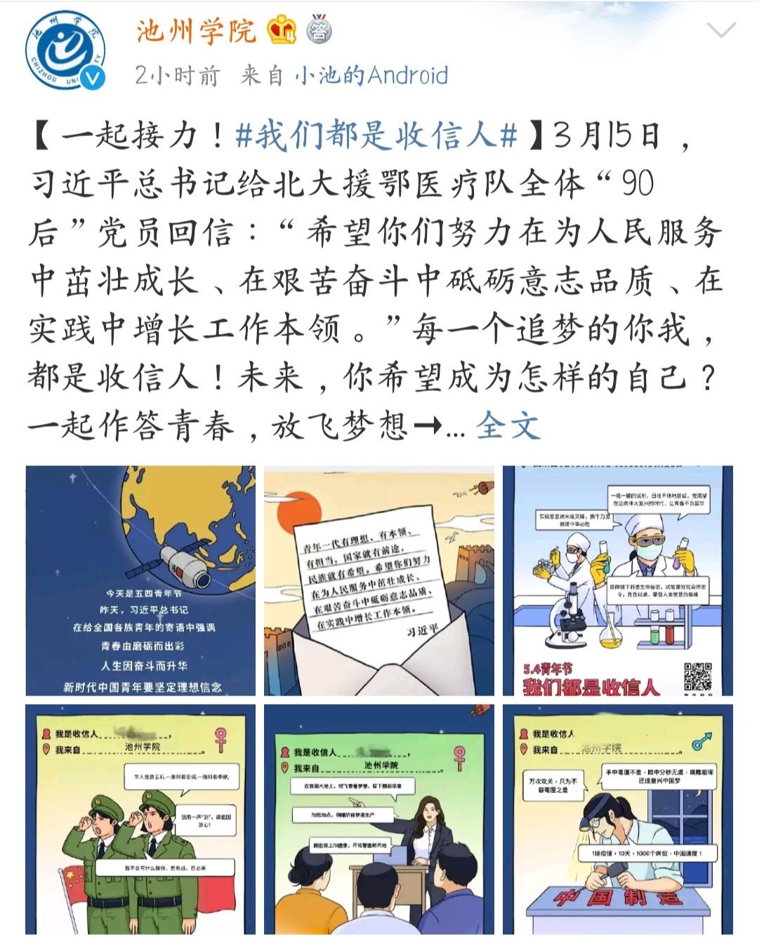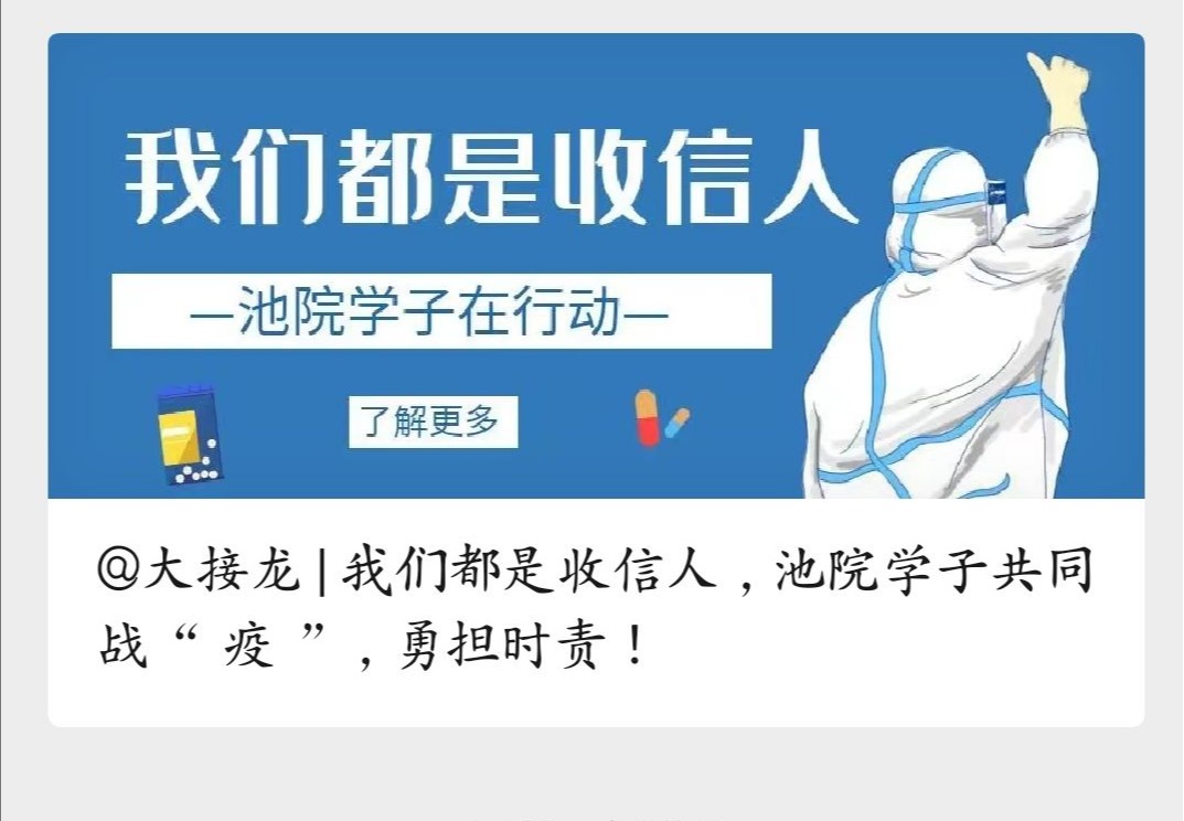 活动期间,学校官方新媒体编发了推文《@大接龙|我们都是收信人,池院学子共同战“役”,勇担时责!》,从“说、写、拍、画、唱、行”等角度讲述PP电子青年学子在疫情防控中,积极响应党的号召,用实际行展现了当代大学生的使命感和责任感。