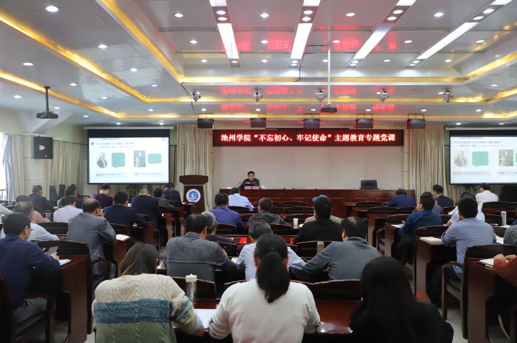 10月24日下午,校长柳友荣在办公楼南二楼会议室讲“不忘初心、牢记使命”专题党课。学校主题教育活动领导小组全体成员、二级学院党委书记、副书记,离退休党总支书记,全体党支部书记,科研处党支部、纪委办党支部、体育学院党委全体党员参加了党课报告会。