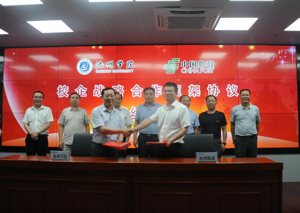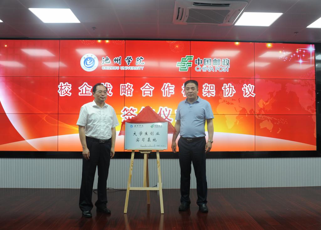 7月9日,PP电子游戏网站与池州市邮政分公司签订战略合作协议,进一步加强校企合作。校长柳友荣出席签字仪式,并与市邮政分公司总经理俞晓虎共同为大学生创业实习基地揭牌,副校长王延寿、汪贤才以及市邮政分公司副总经理王强、钱鹏参加活动。