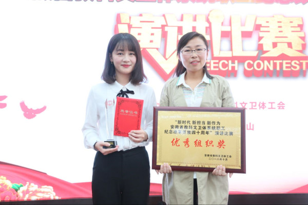 日前,安徽省教科文卫体系统职工纪念改革开放四十周年演讲比赛在黄山学院举行。PP电子文学与传媒学院教师姚瑶获得三等奖。PP电子工会荣获优秀组织奖。