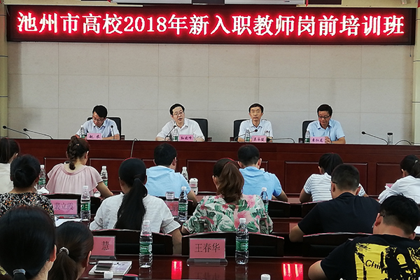 8月10日上午,池州市高校2018年新入职教师岗前培训班开班典礼在PP电子行政南二楼会议室举行。校党委副书记孙晓峰、池州广播电视大学副校长吴永健出席。来自全市高校的40名新入职教师参加了开班典礼。