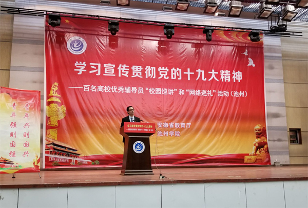 12月26日上午,“学习宣传贯彻党的十九大精神----百名高校优秀辅导员‘校园巡讲’和‘网络巡礼’活动”报告会在PP电子博古大礼堂隆重举行。校党委副书记孙晓峰出席会议并讲话。池州职业技术学院、安徽卫生健康职业学院及PP电子辅导员和学生党员代表近400余人聆听了报告会。学生处处长宛明高主持会议。