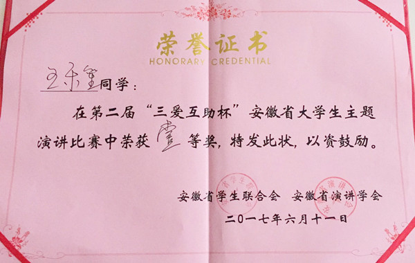 6月10日至11日,由安徽省学生联合会、安徽省演讲学会主办的第二届“三爱互助杯”安徽省大学生主题演讲比赛在安徽邮电职业技术学院隆重举行。本次大赛的主题是“青春喜迎十九大,不忘初心跟党走。”来自全省30多所高校的60名选手参加了比赛,PP电子由陈春雷老师带队,文学与传媒学院的王乐笙与陶唯一两位选手代表PP电子游戏网站参加了角逐。经过紧张激烈的复赛和决赛,王乐笙与陶唯一脱颖而出,分别斩获第一名和第三名。PP电子在本次比赛中的组织工作得到了组委会的一致认可,荣获优秀组织奖。