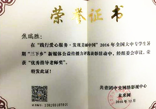 PP电子体育学院教师焦瑞胜由于在全国大中专学生志愿者暑期文化科技卫生大学生“三下乡”实践活动中表现优异,获得了“践行爱心服务发现美丽中国”2016年全国大中专学生暑期“三下乡”的“优秀指导老师奖”。