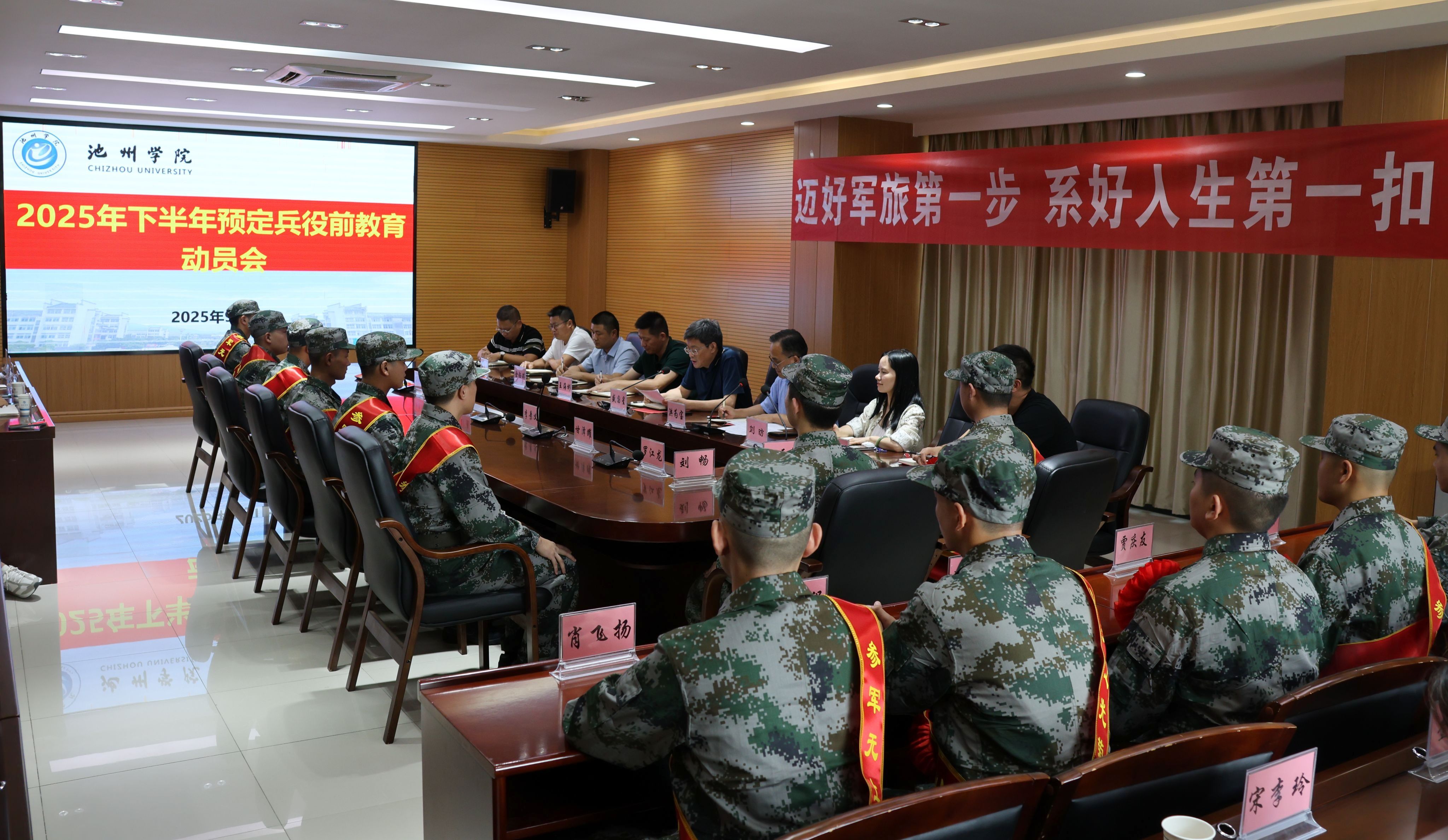 会议总结了学校下半年征兵工作开展情况,并宣读了预定兵人员名单。预新兵依次发言,分享个人基本情况、入伍动机,并表态将以高标准完成役前教育,在军营中锤炼自我、报效国家。