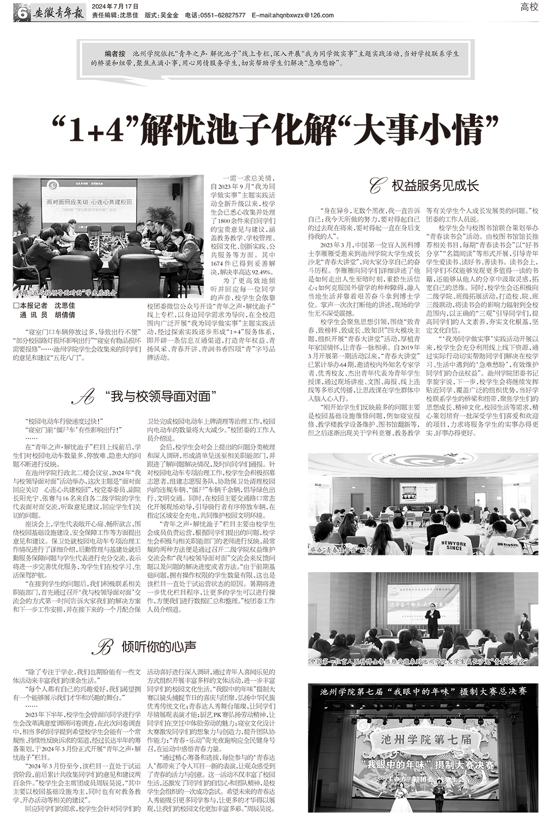 每季度举办一次“我与校领导面对面”座谈交流会,定期召开由校学生会牵头,二级学院学生会、伙管会及宿管会等共同参与的权益维护交流例会,广泛收集同学关于教务教学、校园文化、公共服务等方面权益诉求,及时反映给相关职能部门,畅通学校与学生之间的沟通渠道,有序推进各项工作,解决学生关切问题。指导学生会广泛开展“我为同学做实事”主题实践活动,逐步形成“1+4”服务体系,2024年7月17日获《安徽青年报》整版报道。“1+4”服务体系即在微信公众号上架设“青年之声 解忧池子”专栏,畅通信息渠道,及时掌握学生需求,并由此打造青年权益、青扬风采、青春开讲、青润书香四项“青”字号品牌活动。青年权益,通过“我与校领导面对面”活动和权益维护交流例会等,广泛收集、解决、反馈学生关于教务教学、安全保卫、后勤服务保障等方面权益诉求,保障学生校园生活;青扬风采,根据同学呼声,举办青春校园达人秀、毕业歌会、社团嘉年华等校园文化活动,提供平台展现青年学子青春风采;青春开讲,以“青春大讲堂”为平台,邀请校内外专家学者、同学身边榜样,与学生面对面交流,激发学习热情和成才动力;青润书香,通过青春读书会邀请校内学者与学生同读一本书,分享读书感悟,带动更多同学爱读书、读好书、善读书。