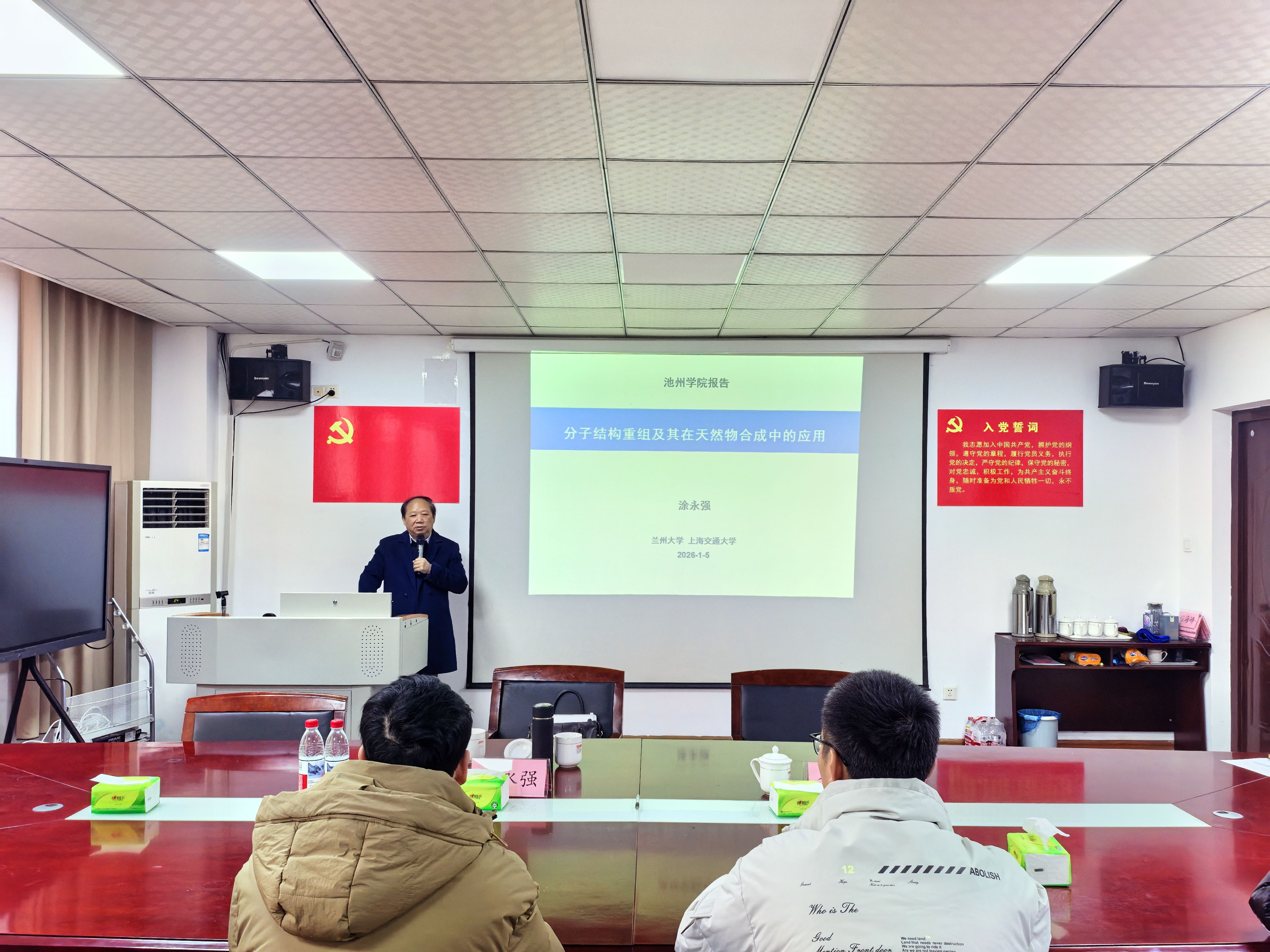 1月5日上午,PP电子材料与环境工程学院“党建引领发展 学术促进成长”学术大讲堂在逸夫南楼会议室举行。兰州大学与上海交通大学双聘教授涂永强院士应邀作题为“分子结构重组及其多环萜类天然产物合成”的学术讲座。讲座由校党委委员、副院长李明玲主持。