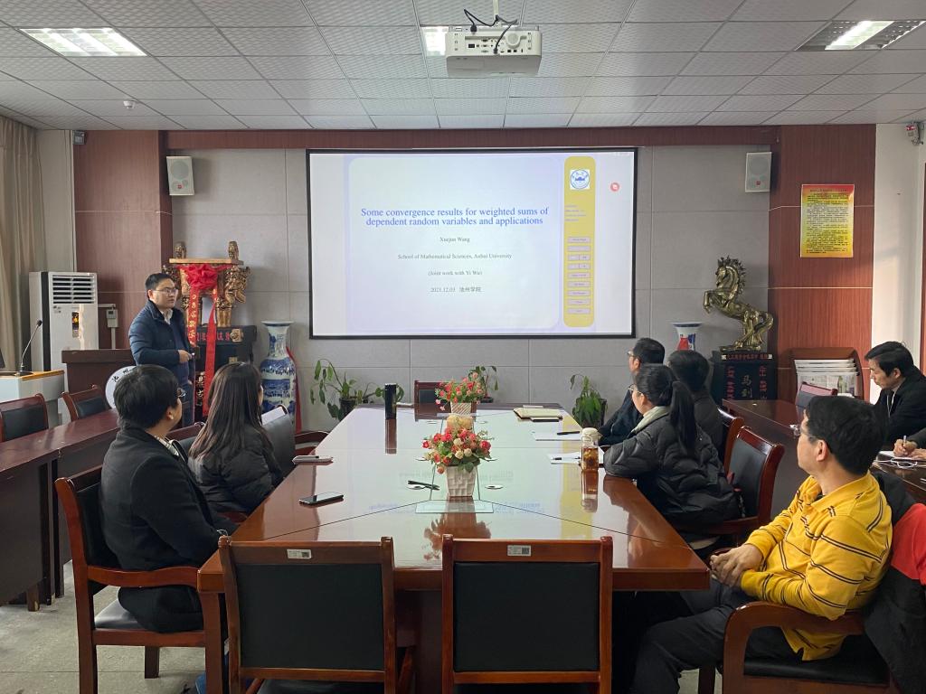 2021年12月3日,安徽大学博士生导师王学军教授来校在博奕一楼会议室做了“相依变量加权和的极限定理及应用”的报告,大数据与人工智能学院副院长周恺教授主持了报告会,部分师生参加了学术报告会。