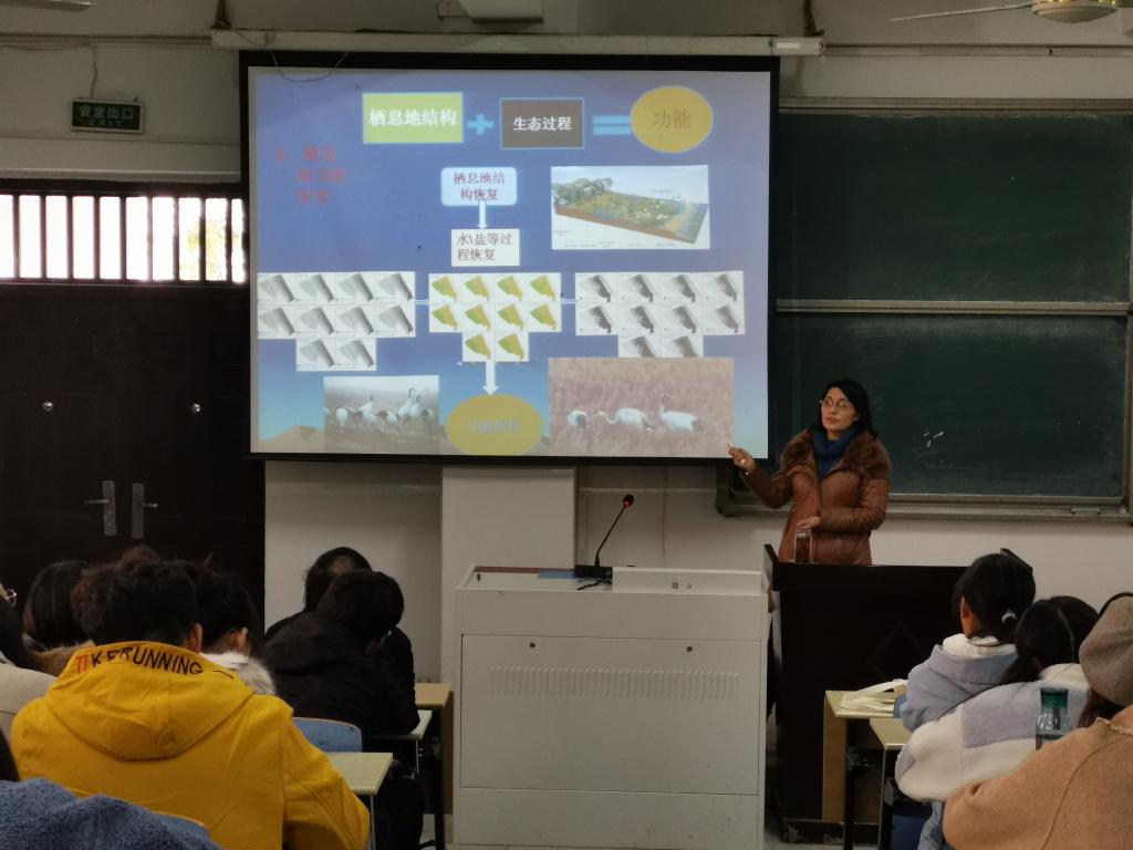 刘红玉教授以丹顶鹤为例,用风趣简洁的语言,深入细致地阐述了丹顶鹤现状分布、生物学及文化特征,分析了丹顶鹤面临威胁及其保护意义,全面阐释了栖息地恢复结构模式的全新理念。报告让我院师生耳目一新、受益匪浅。师生互动环节,同学们积极向刘红玉教授请教和提问,刘红玉教授进行了耐心的回答和讲解。