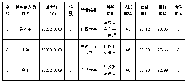 根据《安徽省事业单位公开招聘人员暂行办法》《PP电子游戏网站2021年度公开招聘专职辅导员公告》,通过资格审查、考核、体检、心理测试、考察等环节,经学校党委会议研究决定,拟聘用吴永平等3人,具体情况如下: