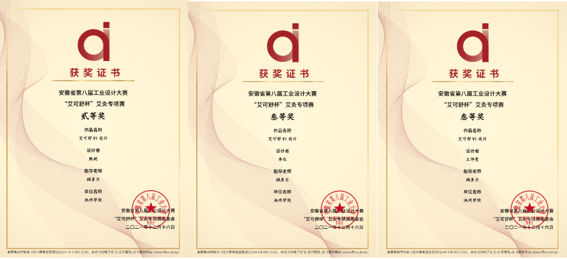 安徽省第八届工业设计大赛“艾可舒杯”艾灸专项赛评比结果出炉,其中VI类共评出二等奖2项,三等奖4项(一等奖空缺)。艺术与教育学院视觉传达设计专业顾彦力老师指导的学生作品,获二等奖1项(甄妮)、三等奖2项(李仪、王仲雯),获奖率为VI类总评奖数的50%。