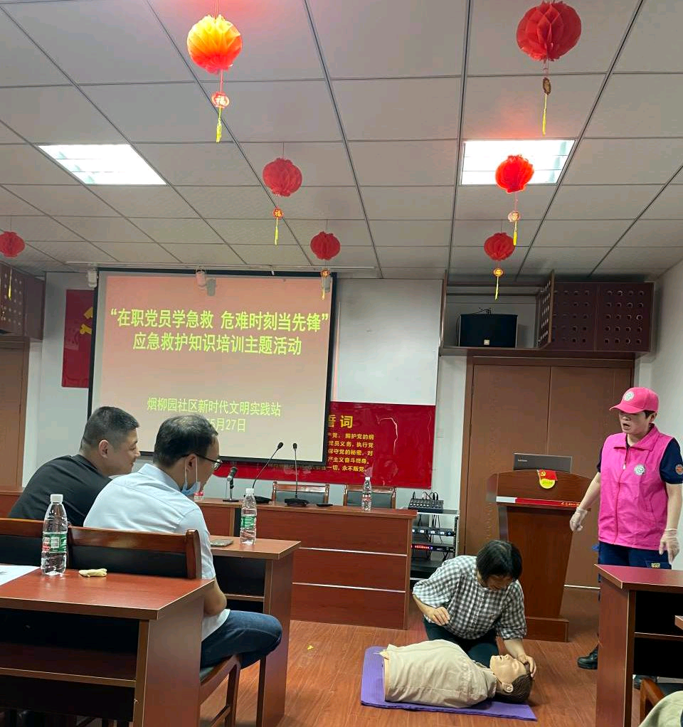 在职党员学急救,危难时刻当先锋。各支部和社区党总支党员参加了由池州市蓝天救援队带来的“学习急救知识,守护生命安全”急救知识主题讲座,认真学习了心肺复苏、气管阻塞应急救护等方面应急救护知识,现场模拟和体验了心肺复苏的手腕姿势、按压位置以及人工呼吸等动作要领,大家纷纷表示,学会了生活中的急救小知识,进一步增强了党员干部的安全意识,提升了应急处置能力。希望在非常时候能够贡献出自己的一份力量,救人于危难。
