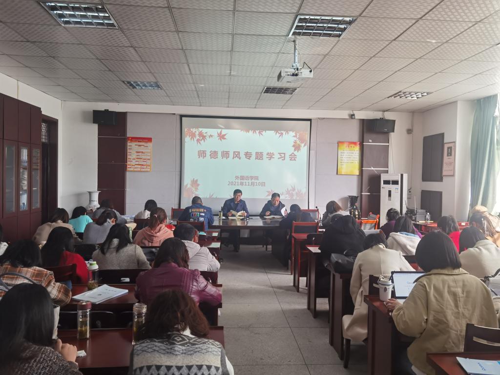 11月10日下午,外国语学院在学院会议室举行师德师风专题学习交流会,全体教职工参加了会议。会议由院党委书记张乐民主持。