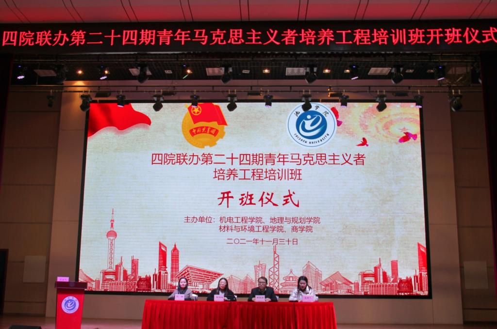 为坚持用习近平新时代中国特色社会主义思想武装青年学生干部头脑,不断提高大学生骨干、团干部等青年群体的综合素质。材料与环境工程学院、机电工程学院、地理与规划学院、商学院联合举办了第二十四期“青年马克思主义者培养工程”大学生骨干培训班。开班典礼于11月30日晚在博古礼堂举行,校团委书记程海峰、校团委副书记李旋宇、材料与环境工程学院党委副书记刘昉应邀出席开班仪式。