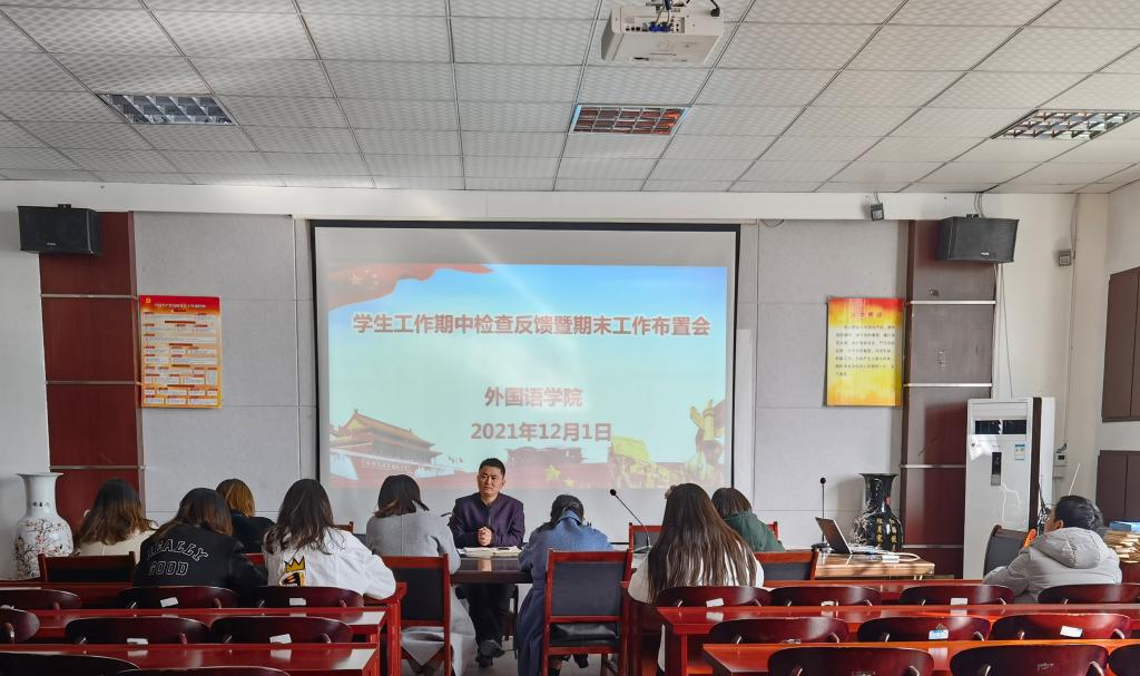 12月1日下午,外国语学院在会议室举行学生工作期中检查反馈暨期末工作布置会。外国语学院全体辅导员参加了会议。会议由外国语学院党委副书记刘军主持。