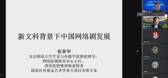 12月13日下午,文学与传媒学院学术院长、北京师范大学艺术与传媒学院教授、博士生导师,网络影视研究中心主任张智华为文学与传媒学院师生线上作了题为“新文科背景下中国网络剧发展”的学术报告。报告会由文学与传媒学院副院长高祥华主持,广播电视编导专业教研室全体教师和部分学生参与。