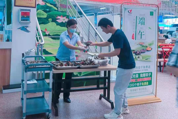 在活动中,各食堂按照统一要求在就餐区域摆放“你送光盘,我赠粽子”为主题的海报,营造“勤俭节约过端午”的节日气氛。各食堂准备了口味各异的1000个粽子供师生选择,师生就餐后只要给食堂工作人员递上空盘,就可以选择一个心仪的粽子。广大就餐的师生积极参与了活动。