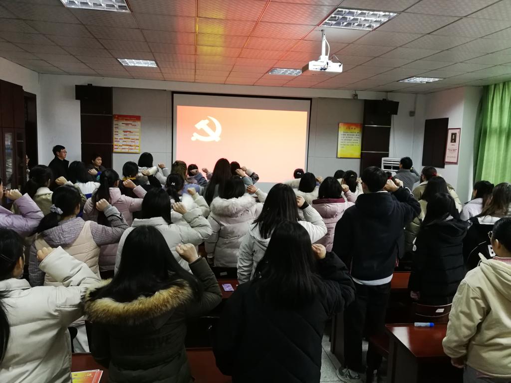 会上,刘军首先宣读了42位同志的入党批复,并对3名教师和39位学生加入党组织表示了欢迎和祝贺。随后,全体预备党员佩戴党员党徽、举起右手、面对党旗,在组织员王成宝老师的带领下进行了庄严的宣誓。