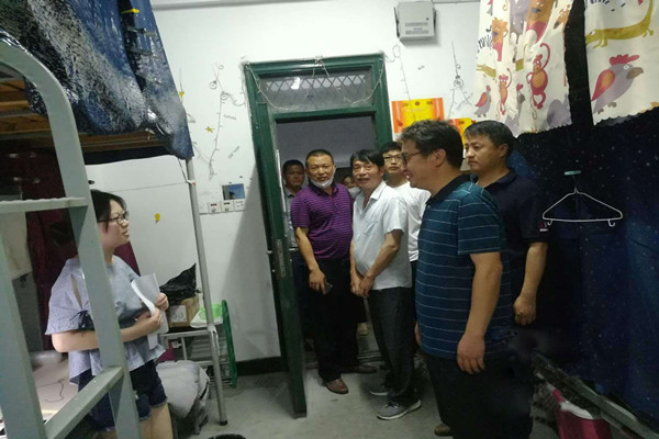 在公寓值班室,张静平对值班人员付出的辛勤劳动表示感谢,希望大家坚守岗位、认真履职,做好学生公寓管理和服务工作,定期对宿舍进行消杀和通风,通过细致温暖的服务,让同学们住得放心、学得安心、生活舒心。