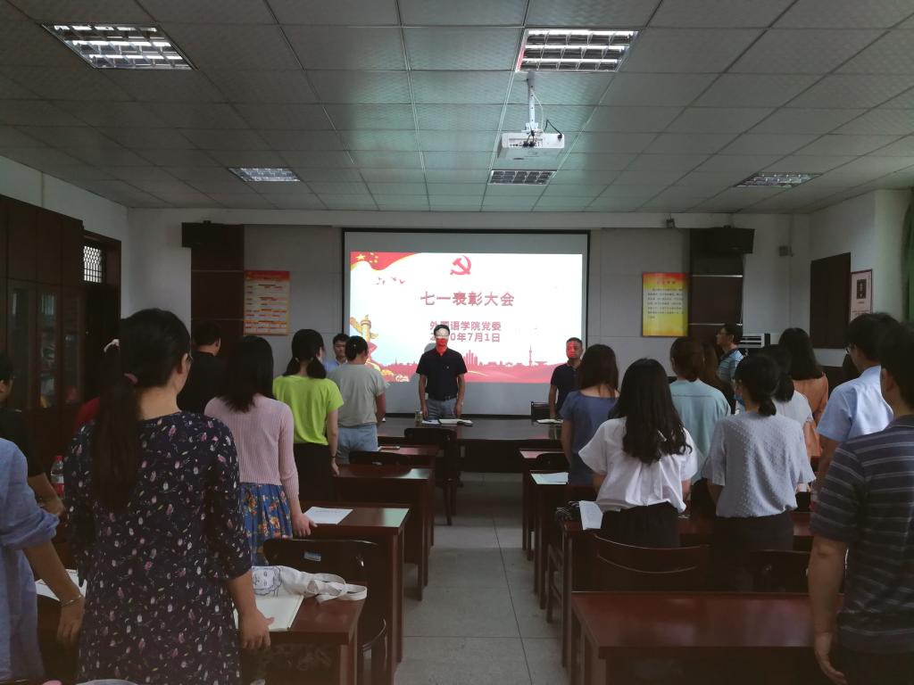 7月1日下午,外国语学院在会议室举行党员大会,庆祝建党99周年,开展党员表彰、重温入党誓词和党史教育主题党课活动。活动由外国语学院党委副书记刘军主持。
