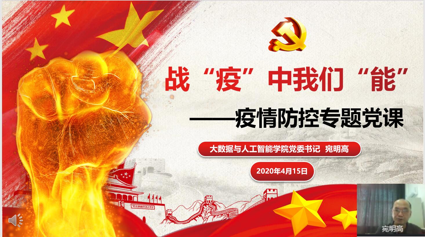 4月15日下午,大数据与人工智能学院举行疫情防控专题党课报告会,部分教师党员及全院学生党员参加,党课采用线上授课的形式进行,院党委书记宛明高主讲。