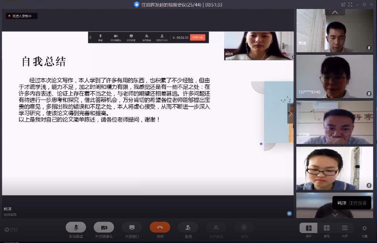 答辩过程中,学生使用钉钉会议或者QQ等平台通过“分享屏幕”对自己的毕业论文成果进行展示和汇报;评委老师认真听取后,与学生“连麦”进行问答,并提出意见和建议;同时,为确保线上答辩的真实、完整、可查,二级学院领导督导答辩全过程,答辩秘书对答辩过程全程记录,整个答辩过程做录屏截屏,作为答辩记录留存。评委老师根据学生论文和答辩汇报情况,对学生论文进行评分。