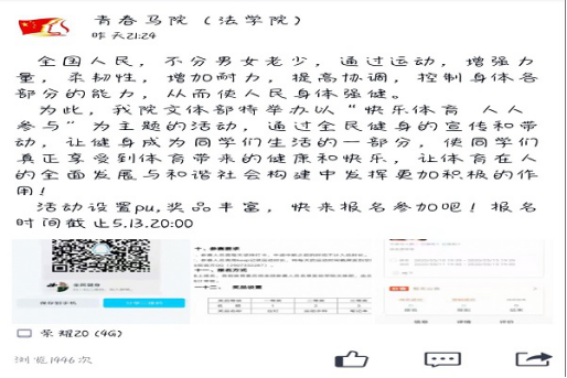 为进一步配合学校做好疫情防控工作,倡导广大学生积极参加健康、文明、科学的健身活动,形成居家锻炼、全民健身、追求健康的新风尚。5月13日起,马克思主义学院(法学院)组织开展线上“全民健身”活动。