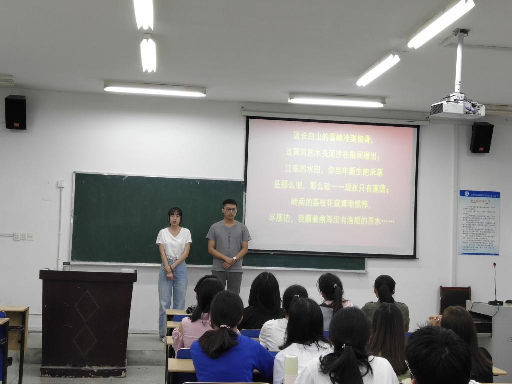 为深入推进“不忘初心、牢记使命”主题教育,庆祝新中国成立70周年,进一步加强爱国主义教育、弘扬爱国主义精神。9月29日晚,商学院学生第二、三党支部组织学生党员和积极分子在博识南403教室开展了以“我和我的祖国”为主题的爱国诗歌朗诵活动。
