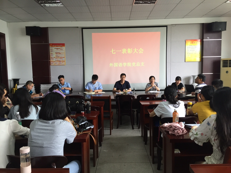 7月2日下午,外国语学院党总支在会议室举行全体党员大会,庆祝中国共产党成立97周年。会议由党总支副书记冯淑慧主持。