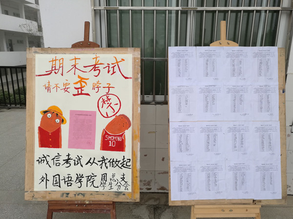 加强考前动员,该学院向全体学生发出诚信考试的倡议, 倡导同学们提高自身道德修养,端正考试态度,当一名诚信考生。按照诚信考试的内容,每名参加考试的学生都签署“诚信考试承诺书”,并公开展示,相互监督,通过自我教育和诚信教育相结合,培养学生树立诚信的良好品德。