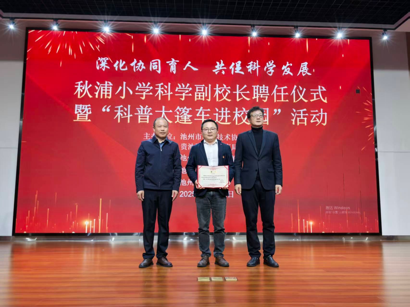 10月28日,池州市贵池区秋浦小学“科学副校长”聘任仪式暨“科普大篷车进校园”活动在秋浦小学多功能报告厅成功举行。池州市科学技术协会主席徐启明、池州市科技馆馆长汪琴、秋浦小学校长钱七二、PP电子游戏网站材料与环境工程学院副院长肖新乐,以及两校师生代表出席本次活动,活动由秋浦小学副校长陆正华主持。