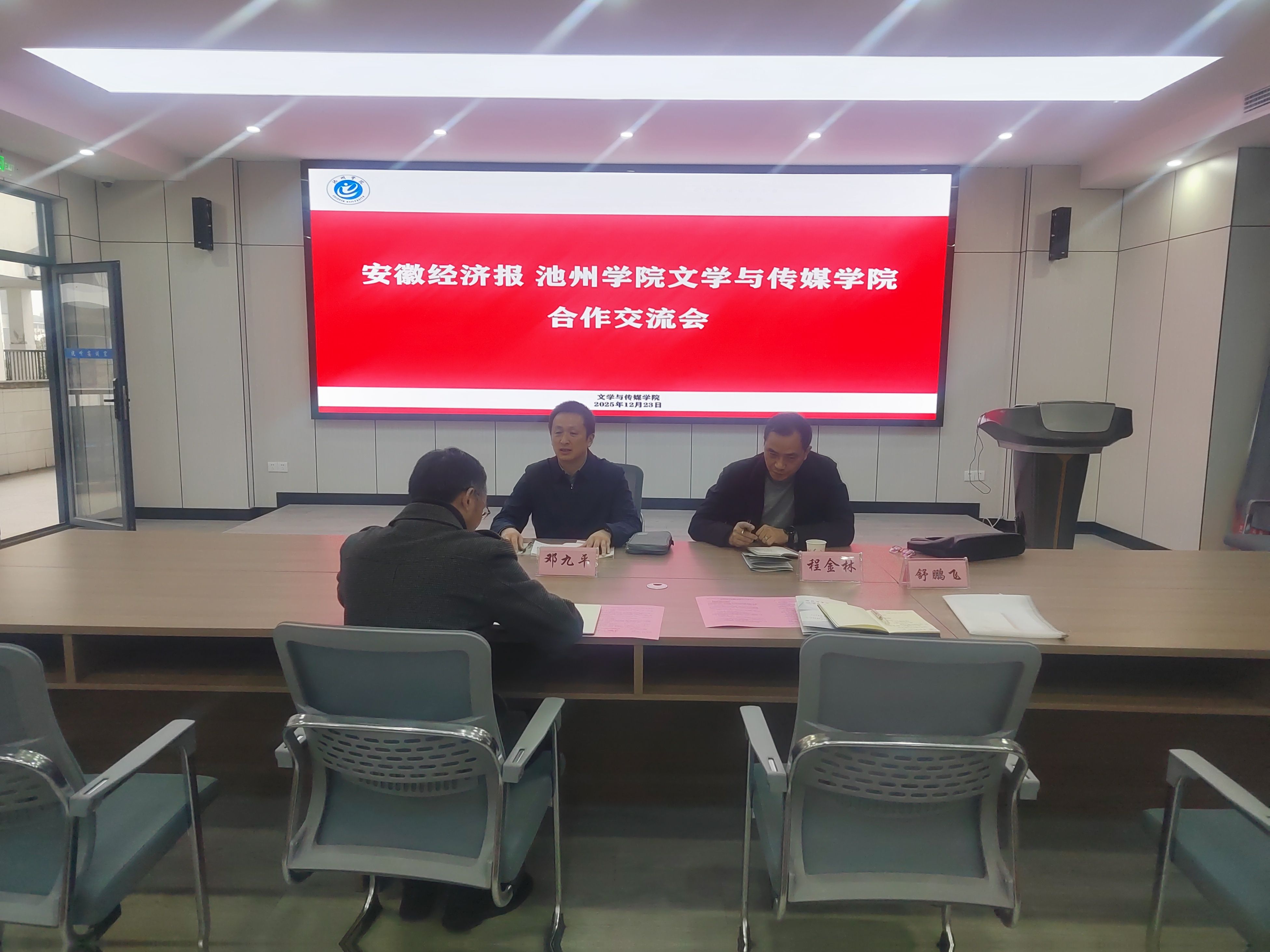 12月23日,文学与传媒学院与安徽经济报合作交流会在PP电子游戏网站成功举行。安徽经济报副总编辑邓九平、池州记者站站长程金林,文学与传媒学院副院长高祥华、实验实训中心负责人舒鹏飞出席会议。
