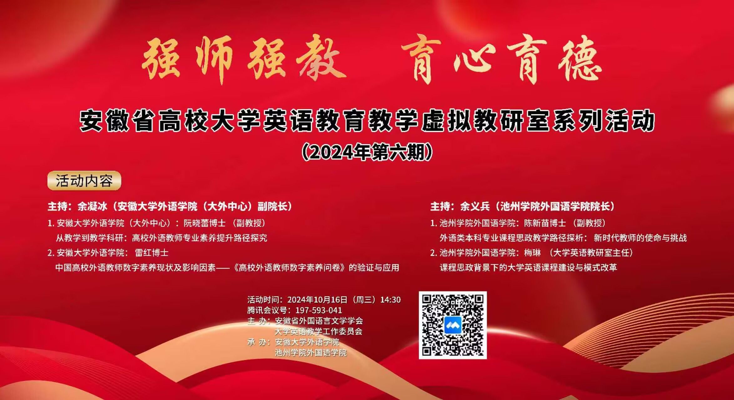 10月16日,外国语学院联合安徽大学外语学院开展安徽省高校大学英语教育教学虚拟教研室活动,安徽省外国语言文学学会秘书长曹军教授致开幕词。