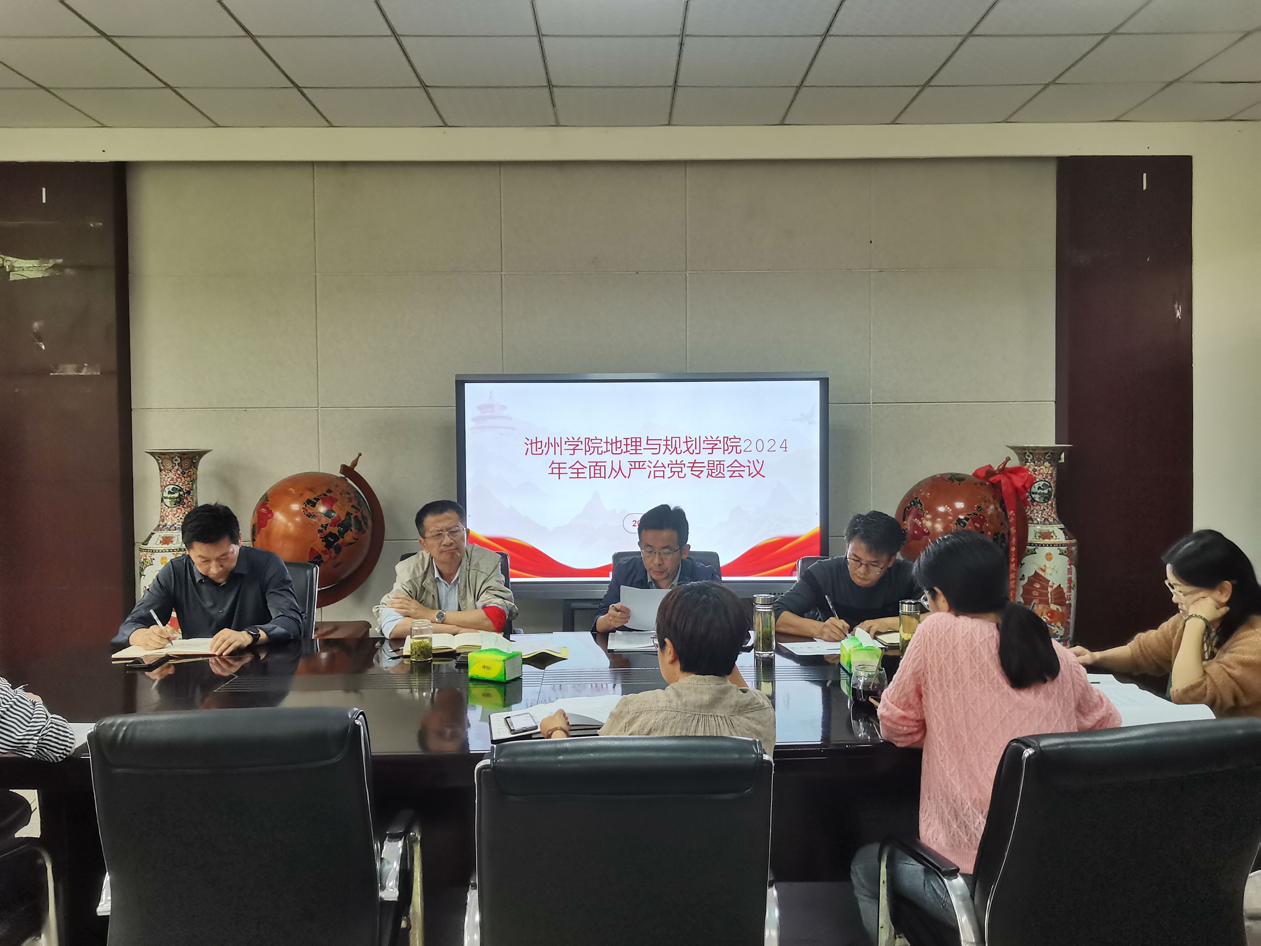 4月29日下午,地理与规划学院在博文南一楼会议室召开2024年全面从严治党专题会议,会议由地理与规划学院党委书记许卫兵主持,学院领导班子成员、科级及以上干部、各支部书记、各教研室主任以及教师代表参加了会议。