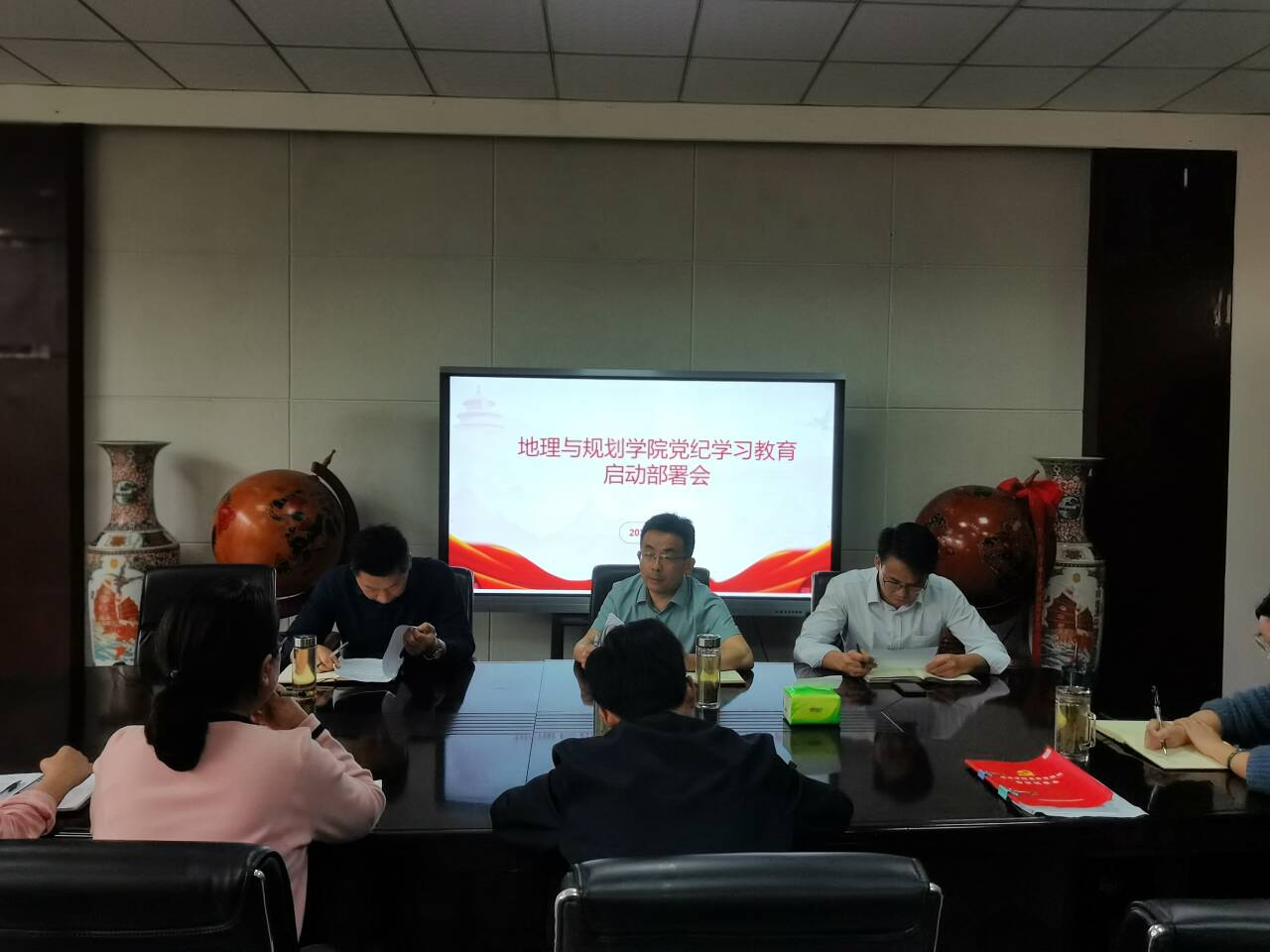 4月15日,地理与规划学院党委在博文楼南党员活动室召开党纪学习教育启动部署会。会议由学院党委书记许卫兵主持,全体党委委员、处级党员干部、党支部书记参加会议。