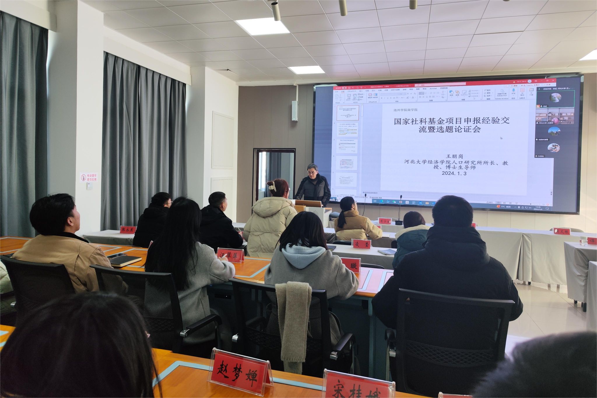 为提升商学院教师学术科研和课题申报能力,鼓励教师申报国家社科基金项目,1月3日下午,商学院开展国家社科基金项目申报培训暨选题论证会,邀请河北大学经济学院博士生导师王朋岗教授做专题培训,本次会议采用线上线下相结合的模式,由商学院副院长吴义根主持。