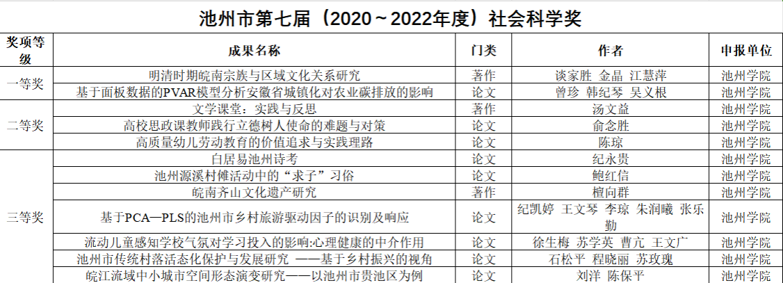近日,池州市第七届(2020-2022年度)社会科学奖评选结果公布,全市共评选出获奖成果18项。PP电子共12项成果获奖,其中一等奖2项,二等奖3项,三等奖7项,再次实现新的突破。
