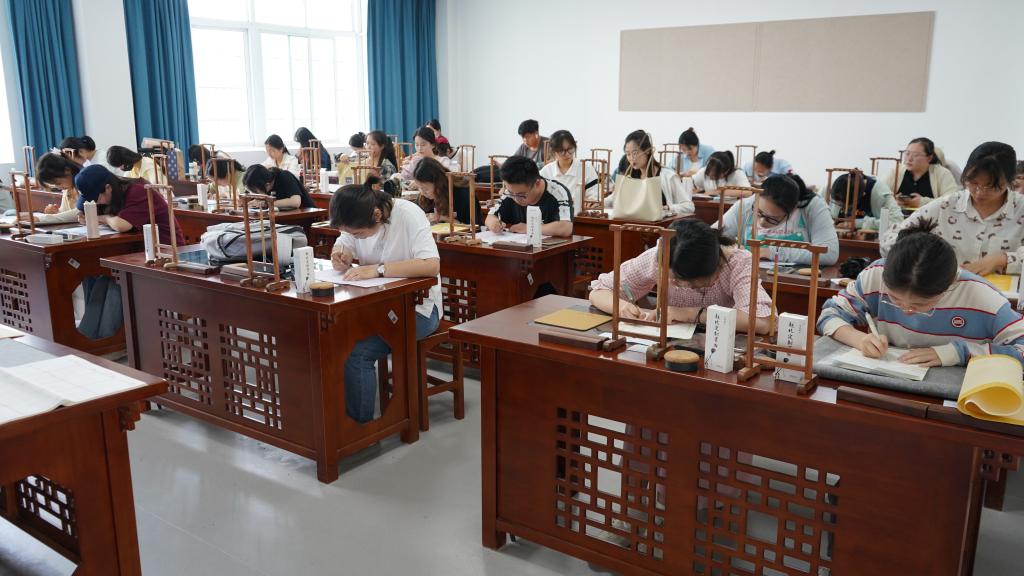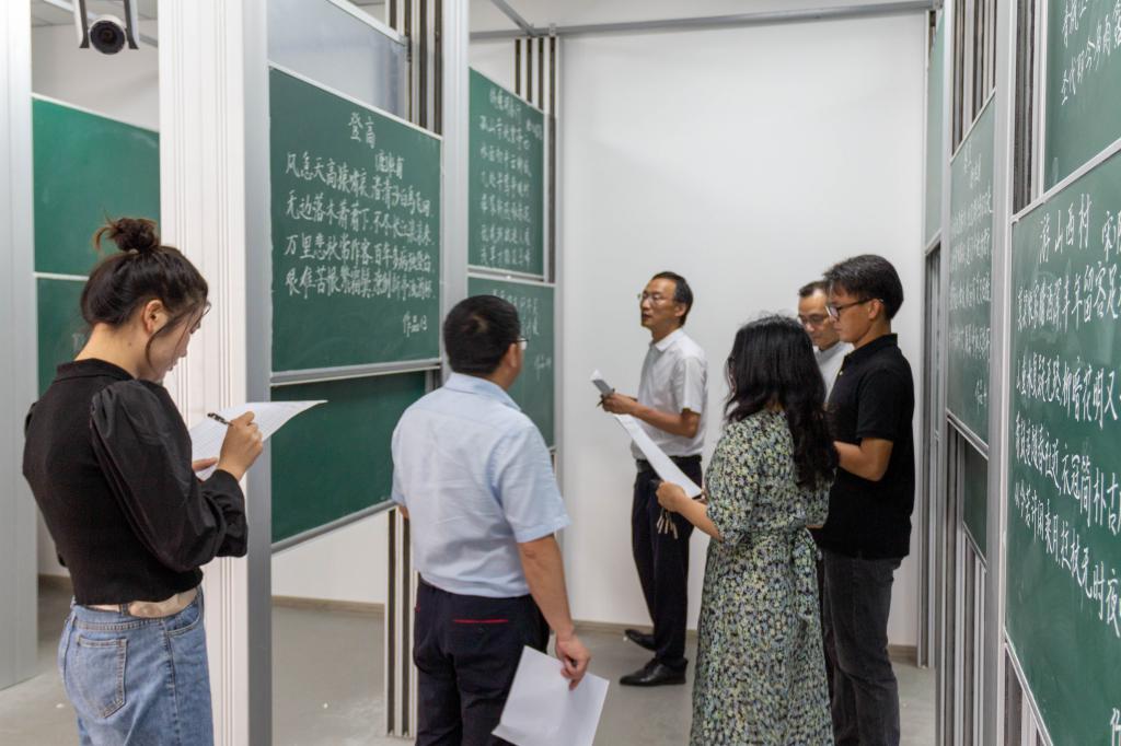 在比赛现场,选手们准备充分,意气风发,或凝神观察书写内容,或细心布置作品章法,在小小的格、线之间挥洒着笔韵墨香,一幅幅书法作品跃然纸上、风格多样,展现了选手们扎实的书法功底。