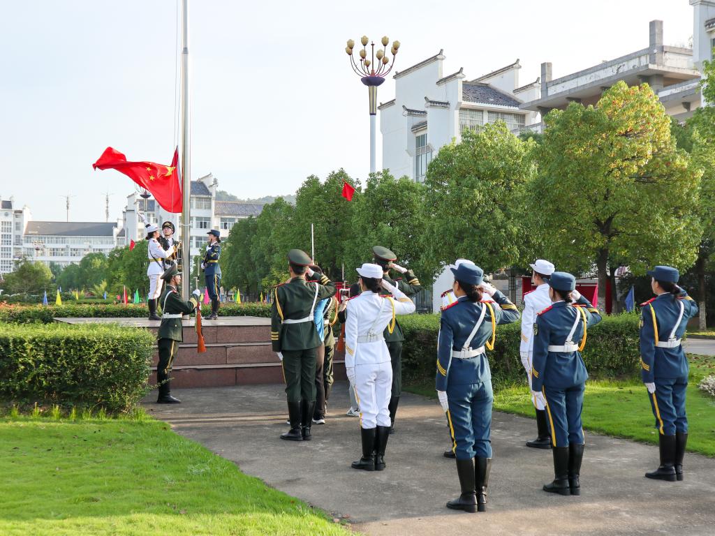 迎着清晨的阳光,国旗护卫队迈着坚定的步伐向国旗台走来。在激昂的国歌声中,五星红旗冉冉升起,随风飘扬。