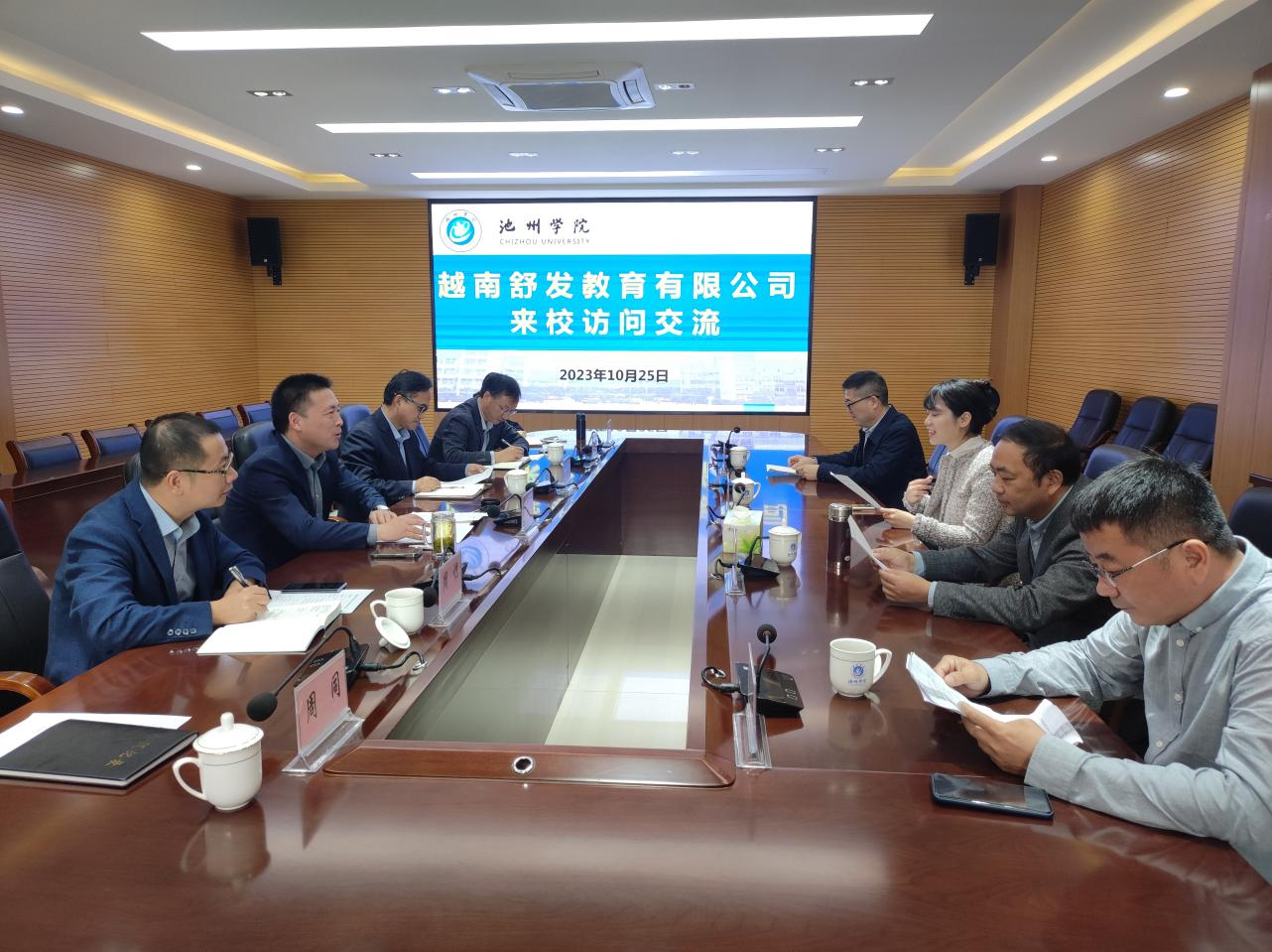 10月25日上午,越南舒发教育有限公司校长邓氏秋来校访问交流,池州市侨联副主席燕根发,池州市侨联秘书长钱若丘,越南中国商会安徽企业联合会副会长刘大海等陪同来访。办公室主任方文利主持座谈。