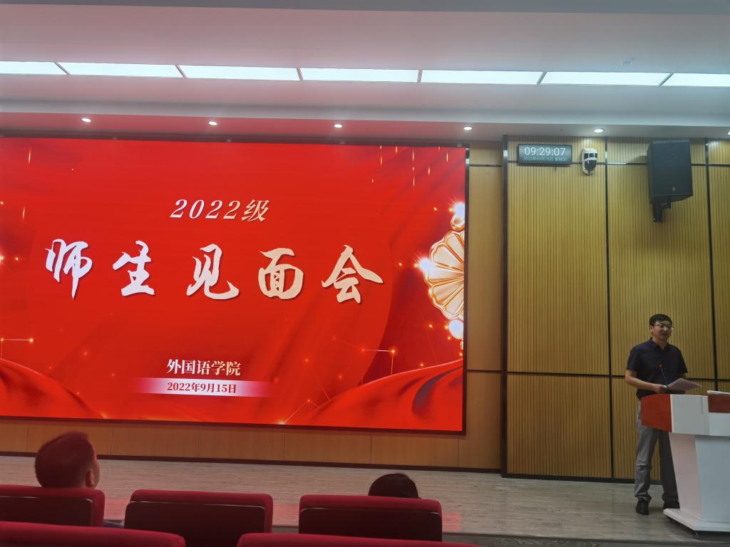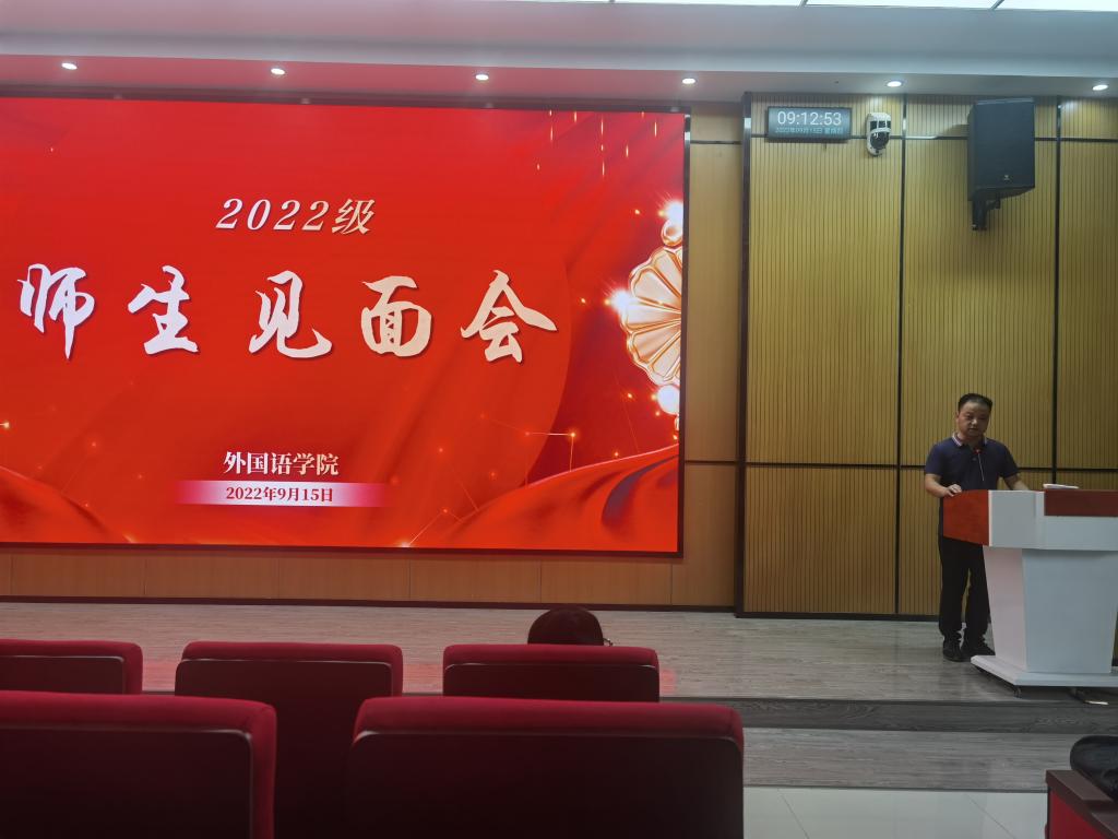 9月15日,外国语学院在公共教学楼1楼报告厅举行2022级新生见面会。外国语学院党委书记张乐民、院长余义兵、教师代表及2022级新生参加了此次会议。见面会由外国语学院副院长宋婷主持。