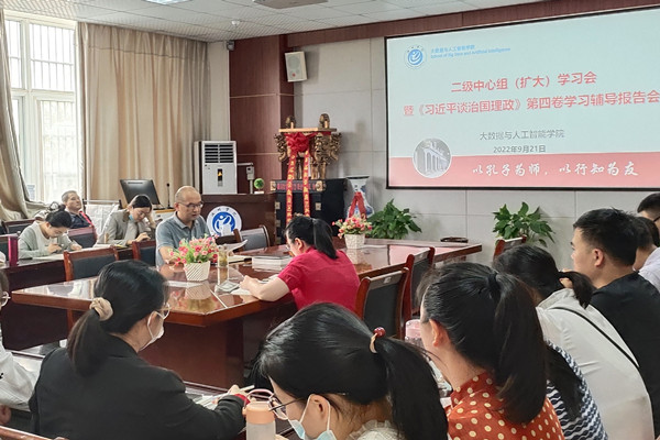 9月21日,大数据与人工智能学院在博奕南一楼会议室召开二级中心组(扩大)学习会暨《习近平谈治国理政》第四卷学习辅导报告会。全体教职工参加会议,学院党委书记宛明高主持报告会。